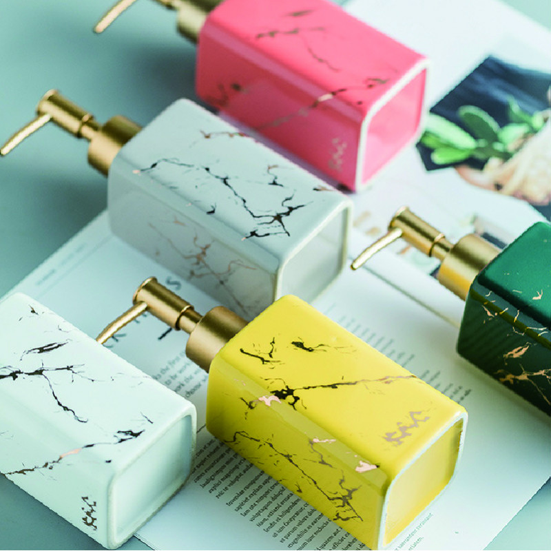 * Marbling yellow hand soap container is ideal for bathroom decor.
