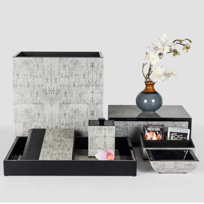 Full range including: wood waste bin, amenity box, amenity tray, service directory, bath salt container, tea tray and soap dish
