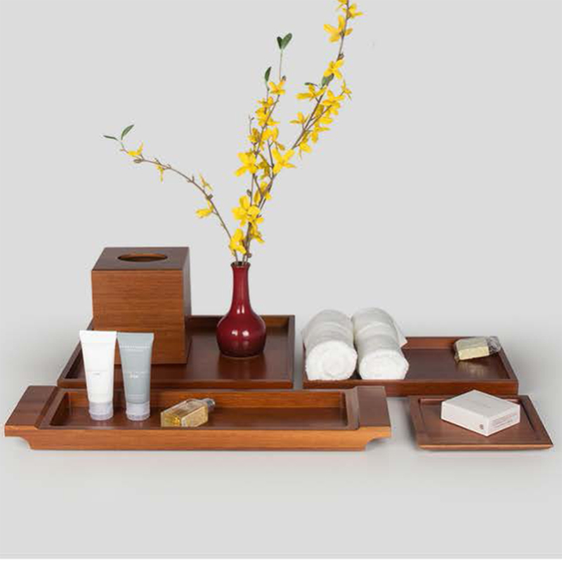 Full range including: wood tissue box, amenity tray, serving tray, towel tray and soap dish