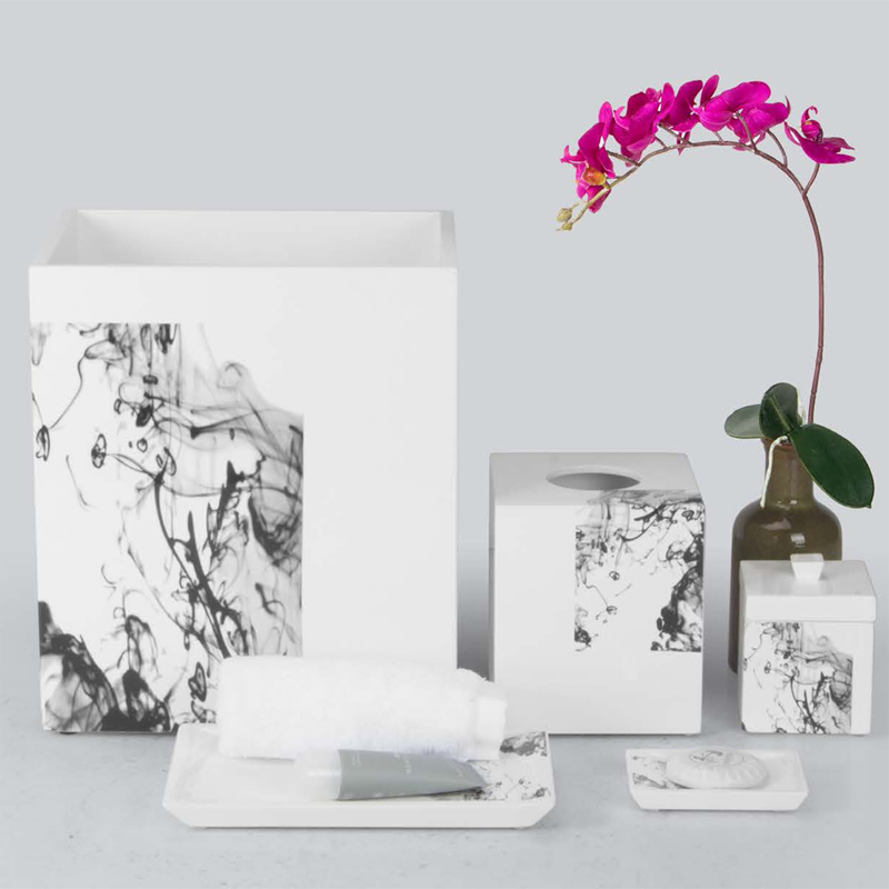 Full range including: wood waste bin, tissue box, bath salt container, towel amenity tray and soap dish